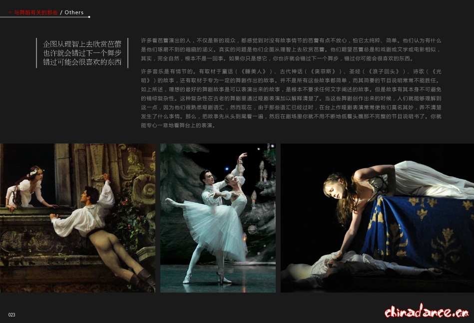 芭蕾是通過演員的形體動作和表情來表達(dá)思想感情的,是一種不說話的藝術(shù)。欣賞芭蕾,大致上有兩條思路。一條是傳統(tǒng)的,一條是現(xiàn)代的。一般主張欣賞的方法與欣賞的對象相統(tǒng)一:即用一絲不茍的傳統(tǒng)思路,去欣賞“早期”、“浪漫”和“古典”這三個傳統(tǒng)時(shí)期的芭蕾舞劇、音樂型芭蕾和純粹型芭蕾。