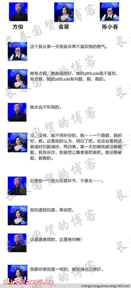朱潔靜。上海歌舞團有限公司首席、國家一級演員, 畢業于上海市舞蹈學校上海戲劇學院現任中國舞蹈家協會會員上海舞蹈家協會理事,是一位青年舞蹈家。 朱潔靜具備出色的舞蹈資質。其代表作品有:《霸王別姬》、《天邊的紅云》、《野斑馬》、《根之雕》、《語絲》、《國風》、《當代節奏》、《中國扇》、《火鳳祥云》、《秀色》、《夜深沉》、《舞者別戀》、《靜飛》、《弄清影》等數十部,并多次出訪澳大利亞、加拿大、法國、日本、馬來西亞、瑞典、俄羅斯等國家進行文化交流演出。 朱潔靜在國內各大舞蹈比賽中屢獲佳績,出色的表演得到了業內人士的認可。其在《舞林爭霸》中,被導師陳小春、金星、方俊認為態度作假,說話做作,舞品值得懷疑?!?br> 語音視頻曝光 29日凌晨,網易博主“長春國貿”發表博文,稱接到某舞蹈真人秀節目一離職工作人員的爆料,其內容直指平安緋聞女友朱潔靜。爆料人向長春國貿提供了一段音頻資料,據稱源于2月25日節目錄制現場無意中收錄的一段導師之間的對話:陳小春、金星、方俊在議論某位學員,認為其態度作假,說話做作,舞品值得懷疑。據爆料者稱,在這兩分鐘不到的錄音中,被導師們頻繁提及的舞者,其實就是前不久被曝光的平安緋聞女友——朱潔靜。 長春國貿博客原文: 28日,長春國貿得到某舞蹈真人秀節目一離職工作人員的爆料,其內容直指平安緋聞女友朱潔靜。爆料人向長春國貿提供了一段音頻資料,據稱源于2月25日節目錄制現場無意中收錄的一段導師之間的對話,雖然背景有些嘈雜,但還能清晰可辨對話內容:陳小春、金星、方俊在議論某位學員,認為其態度作假,說話做作,舞品值得懷疑。據爆料者稱,在這兩分鐘不到的錄音中,被導師們頻繁提及的舞者,其實就是前不久被曝光的平安緋聞女友——朱潔靜。 若只是其中的一個導師對朱潔靜有意見,那或許存在個人偏見的可能性,但如今三大導師一致認定朱潔靜有問題,那看來這位朱大小姐貌似人品不佳噢!另外據爆料人介紹:朱潔靜臺上、臺下表現有著天壤之別,雖說這位上海歌舞首席的舞蹈功力毋庸置疑,但卻缺乏了一個舞者應該具備的態度。就像金星說的,她滿口謊言,她的attitude有問題,舞蹈功底和舞者態度是兩回事。金星作為導師雖然要求嚴格言語犀利,但臺上臺下作風一致,語言直率且從不說假話,音頻中“金犀利”的話自然可信。聯想到此前朱潔靜曾在舞臺上說自己用最美好的青春年華堅守最清貧的職業,如今看來她那番慷慨激昂的舞者論不過是其搏出位的一種手段而已。而一向好脾氣的陳小春也忍不住吐槽:從第一天開始就非常不喜歡她的傲氣。回看初賽期間,當朱潔靜一支舞畢,陳小春開始點評時,朱潔靜全程與陳小春沒有目光交流,大有無視導師之嫌。方俊也直言朱潔靜從來不聽指揮,暗指朱潔靜是個極端我行我素的舞者,訓練過程中極其自我,全然不服從大局。 評委此番評論,確實有據可依。之前見諸報章的她與平安街頭擁吻照事件被炒得沸沸揚揚,兩人側對機位角度可疑,疑似擺拍。朱潔靜被指借機抱平安大腿上位。的確,頂著上海歌舞團首席舞者和平安女友的雙重身份參加比賽,博名博利的參賽動機十分明顯。此前種種,不是巧合,而是有意為之。站在專業角度,導師們不能因為主觀因素淘汰一個極具舞蹈功力的學員,但作為觀眾,我們完全有理由摒棄一個借炒作上位、動機不純的舞者。朱潔靜的虛偽面具已徹底被揭開,所謂千人所指無病而死,朱大小姐的以后的日子定不好過,作為男友的平安也大有躺槍的可能,但長春國貿的眼里是容不得一粒沙子的,在此只能對平安兄深感抱歉了! 28日,長春國貿得到某舞蹈真人秀節目一離職工作人員的爆料,其內容直指平安緋聞女友朱潔靜。爆料人向長春國貿提供了一段音頻資料,據稱源于2月25日節目錄制現場無意中收錄的一段導師之間的對話,雖然背景有些嘈雜,但還能清晰可辨對話內容:陳小春、金星、方俊在議論某位學員,認為其態度作假,說話做作,舞品值得懷疑。據爆料者稱,在這兩分鐘不到的錄音中,被導師們頻繁提及的舞者,其實就是前不久被曝光的平安緋聞女友——朱潔靜。 若只是其中的一個導師對朱潔靜有意見,那或許存在個人偏見的可能性,但如今三大導師一致認定朱潔靜有問題,那看來這位朱大小姐貌似人品不佳噢!另外據爆料人介紹:朱潔靜臺上、臺下表現有著天壤之別,雖說這位上海歌舞首席的舞蹈功力毋庸置疑,但卻缺乏了一個舞者應該具備的態度。就像金星說的,她滿口謊言,她的attitude有問題,舞蹈功底和舞者態度是兩回事。金星作為導師雖然要求嚴格言語犀利,但臺上臺下作風一致,語言直率且從不說假話,音頻中“金犀利”的話自然可信。聯想到此前朱潔靜曾在舞臺上說自己用最美好的青春年華堅守最清貧的職業,如今看來她那番慷慨激昂的舞者論不過是其搏出位的一種手段而已。而一向好脾氣的陳小春也忍不住吐槽:從第一天開始就非常不喜歡她的傲氣?;乜闯踬惼陂g,當朱潔靜一支舞畢,陳小春開始點評時,朱潔靜全程與陳小春沒有目光交流,大有無視導師之嫌。方俊也直言朱潔靜從來不聽指揮,暗指朱潔靜是個極端我行我素的舞者,訓練過程中極其自我,全然不服從大局。 評委此番評論,確實有據可依。之前見諸報章的她與平安街頭擁吻照事件被炒得沸沸揚揚,兩人側